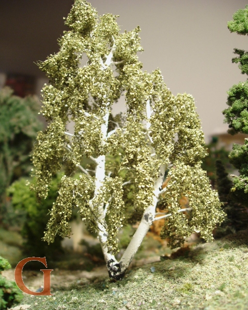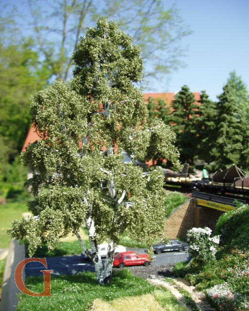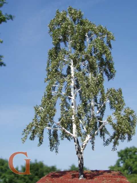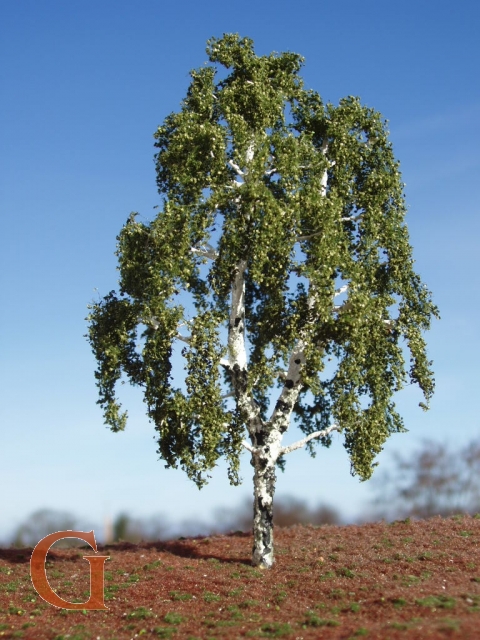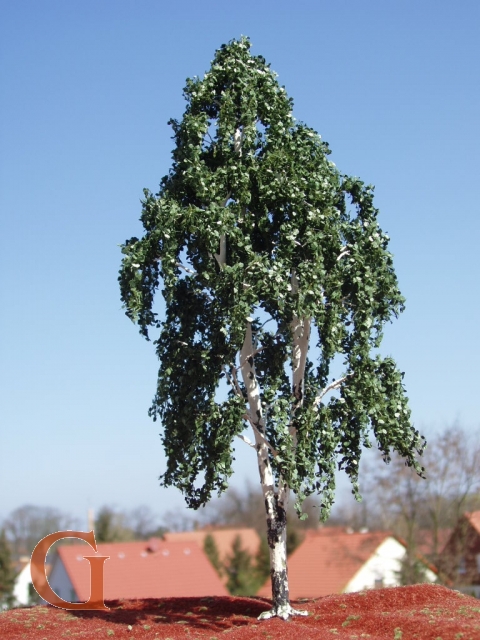 Die Hänge-Birke, auch Gemeine Birke, Sandbirke, Weißbirke oder Warzenbirke genannt (Betula pendula), die diesem Modell als Vorbild diente, ist in Europa (außer Nordskandinavien), Nordamerika und Asien verbreitet, wächst meistens auf nährstoffarmen Böden und gilt als wichtigste Pionierpflanze. Sie erreicht dabei in der Natur eine Wuchshöhe von 15 bis 25 (max. 30) Metern. Wählen Sie die passende Größe für Ihren Modellmaßstab oder folgen Sie unserer Empfehlung entsprechend der Nenngröße Ihrer Modellbahn und erhalten Sie einen exklusiven Modellbaum.