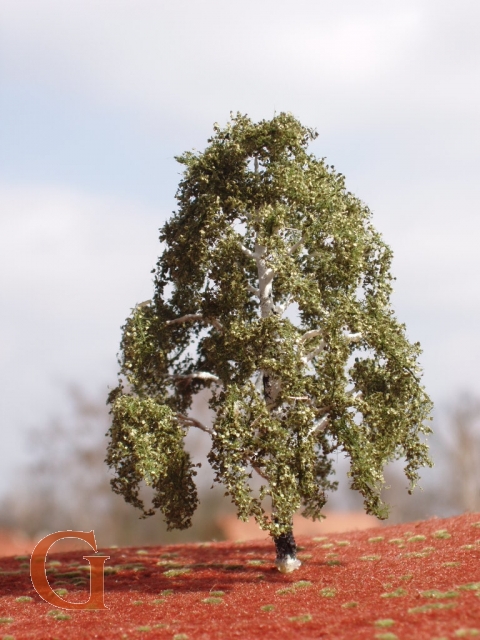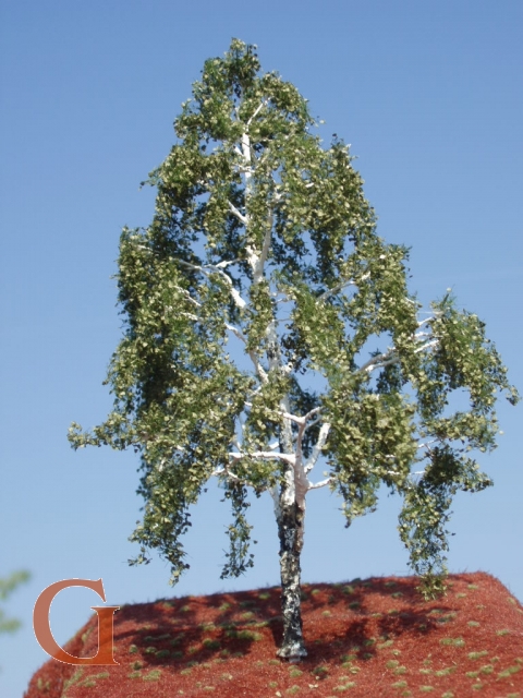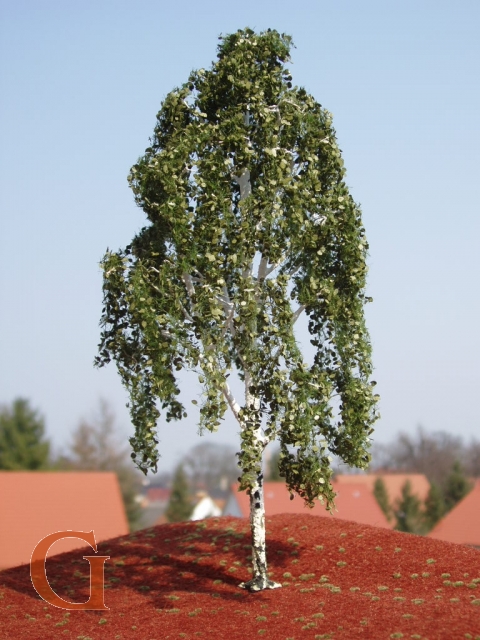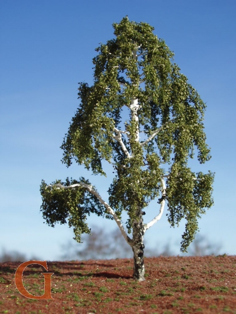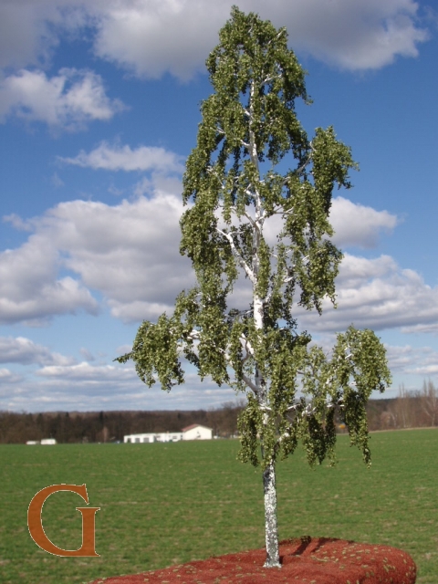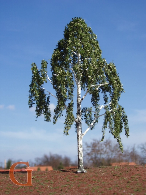 Die Hänge-Birke, auch Gemeine Birke, Sandbirke, Weißbirke oder Warzenbirke genannt (Betula pendula), die diesem Modell als Vorbild diente, ist in Europa (außer Nordskandinavien), Nordamerika und Asien verbreitet, wächst meistens auf nährstoffarmen Böden und gilt als wichtigste Pionierpflanze. Sie erreicht dabei in der Natur eine Wuchshöhe von 15 bis 25 (max. 30) Metern. Wählen Sie die passende Größe für Ihren Modellmaßstab oder folgen Sie unserer Empfehlung entsprechend der Nenngröße Ihrer Modellbahn und erhalten Sie einen exklusiven Modellbaum.