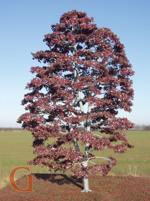 Die Blutbuche (Fagus sylvatica f. purpurea), die diesem Modell als Vorbild diente und wegen ihrer rötlichen Blätter auch Purpurbuche genannt wird, ist eine Mutation der heimischen Buche (Rotbuche). Vorwiegend ist sie in kultivierten Bereichen (Parks u. ä.) zu finden. Sie erreicht in der Natur eine Wuchshöhe von 30 Metern. Wählen Sie die passende Größe für Ihren Modellmaßstab oder folgen Sie unserer Empfehlung entsprechend der Nenngröße Ihrer Modellbahn und erhalten Sie einen exklusiven Modellbaum. Da die rote Blattfarbe im Verlauf der Vegetationsperiode abnimmt, ist diese Buchenvariante nur für Sommer verfügbar.