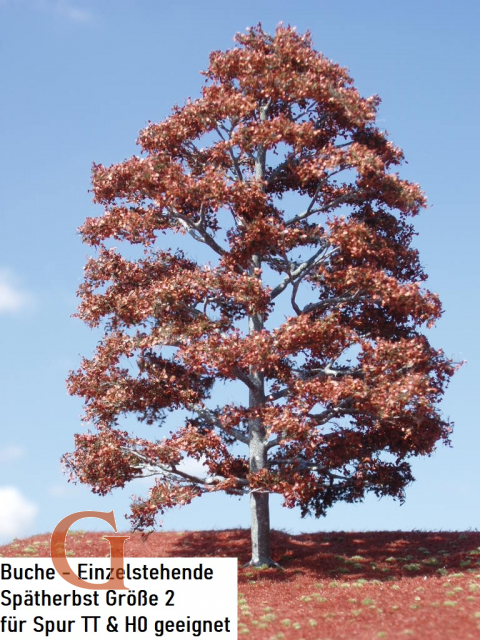 Die Rotbuche (Fagus sylvatica), umgangssprachlich schlicht als Buche bezeichnet, die diesem Modell als Vorbild diente, findet in Europa sehr weite Verbreitung und ist die einzige in Europa heimische Buchenart. Sie erreicht in der Natur eine Wuchshöhe von 30 Metern, in dichten Wäldern auch bis zu 45 Metern. Wählen Sie die passende Größe für Ihren Modellmaßstab oder folgen Sie unserer Empfehlung entsprechend der Nenngröße Ihrer Modellbahn und erhalten Sie einen exklusiven Modellbaum.