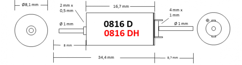 Glockenanker-Motor ∅ ca. 8 mm, Länge ca. 16 mm mit höherer Leistung als der 0816 D zum Einbau in Modellfahrzeuge mit zwei Wellenanschlüssen