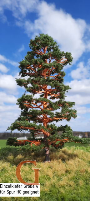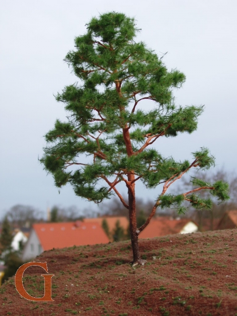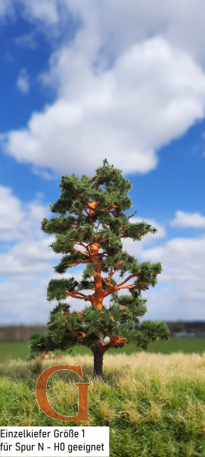 Die Gemeine Kiefer (Pinus sylvestris), auch Waldkiefer, Rotföhre, Forche oder Weißkiefer genannt, die diesem Modell als Vorbild diente, ist in Europa bis weit nach Sibirien verbreitet und auf sehr nährstoffarmen Böden (Sandböden) anzutreffen. Ihre natürliche Verbreitung ist in Deutschland sehr gering, ihr trotzdem sehr hoher Anteil am Baumbestand ist der Forstwirtschaft zu verdanken. Sie erreicht in der Natur eine Maximalhöhe von 48 Metern. Wählen Sie die passende Größe für Ihren Modellmaßstab oder folgen Sie unserer Empfehlung entsprechend der Nenngröße Ihrer Modellbahn und erhalten Sie einen exklusiven Modellbaum.