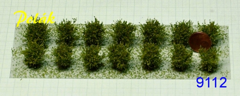 14 Stück wildwachsende, niedrige Modell-Sträucher mit hellgrüner Belaubung, Höhe ca. 1,5 cm, fein - kleine Laubgröße, empfohlen für die Nenngrößen TT, H0 und 0