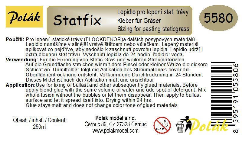 Verarbeitungstipp: Untergrund großzügig einstreichen, unverzüglich das Streumaterial auftragen, vollkommene Durchtrocknung in 24 Stunden. Für einen natürlich wirkenden Untergrund mischen Sie Statfix mit Pigmentpulver in passender Farbe. Zum Auftragen empfehlen wir ein elektrostatisches Begrasungsgerät, um aufrechte Grasfasern zu erzielen.