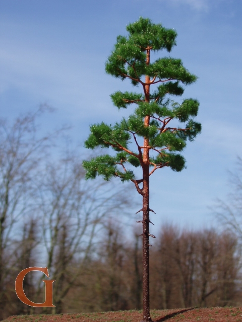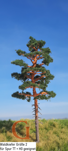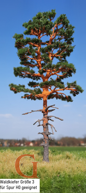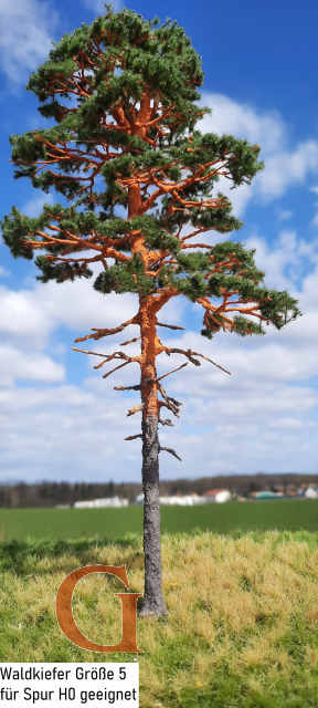 Die Gemeine Kiefer (Pinus sylvestris), auch Waldkiefer, Rotföhre, Forche oder Weißkiefer genannt, die diesem Modell als Vorbild diente, ist in Europa bis weit nach Sibirien verbreitet und auf sehr nährstoffarmen Böden (Sandböden) anzutreffen. Ihre natürliche Verbreitung ist in Deutschland sehr gering, ihr trotzdem sehr hoher Anteil am Baumbestand ist der Forstwirtschaft zu verdanken. Sie erreicht in der Natur eine Maximalhöhe von 48 Metern. Wählen Sie die passende Größe für Ihren Modellmaßstab oder folgen Sie unserer Empfehlung entsprechend der Nenngröße Ihrer Modellbahn und erhalten Sie einen exklusiven Modellbaum.