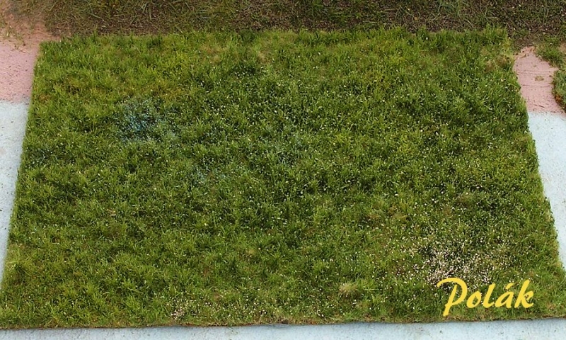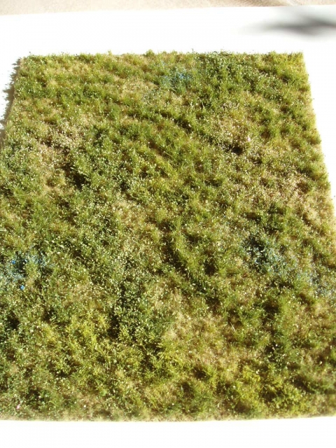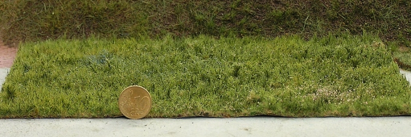 Eine Wiese mit grünen und vertrockneten Grasanteilen sowie mit weißen und blauen Blumen, Abmessungen 25 x 20 cm - Höhe 1,0-1,5 cm