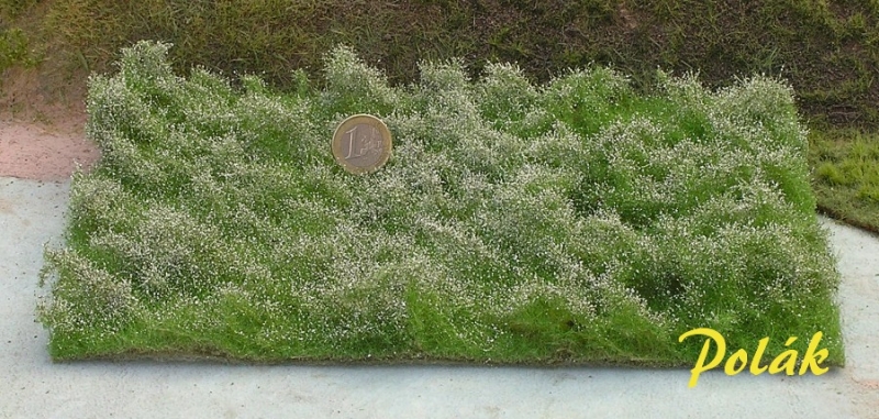 La superficie strutturata con fioritura bianca aggiunge accenti naturali a scene primaverili e di inizio estate. Si integra perfettamente nelle transizioni tra prati, zone cespugliose e bordi leggermente invasi. Il supporto flessibile in tessuto non tessuto si ritaglia con precisione e si adatta bene a forme morbide.