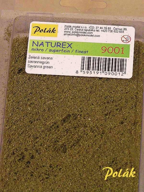 Naturex è un materiale scenografico da spargere superfine nella tonalità Verde savana. È adatto per effetti naturali di vegetazione e copertura del terreno su plastici ferroviari, diorami e paesaggi in miniatura.